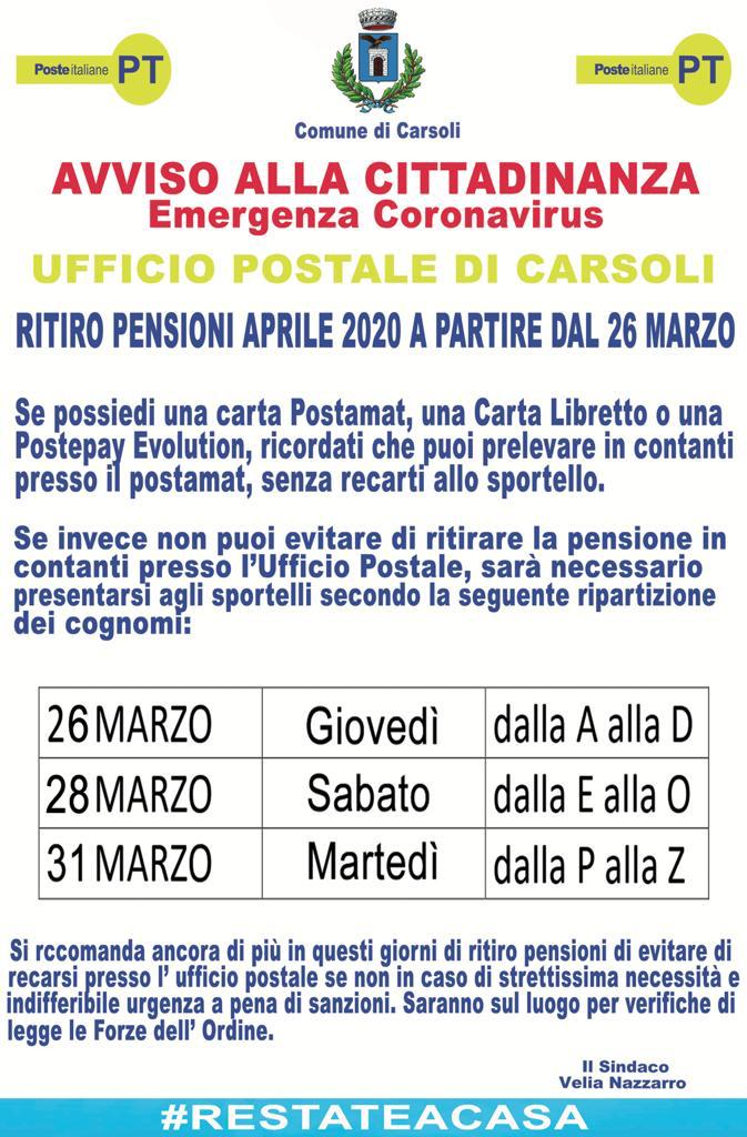 AVVISO RITIRO PENSIONI APRILE 2020 A PARTIRE DAL 26 MARZO 2020