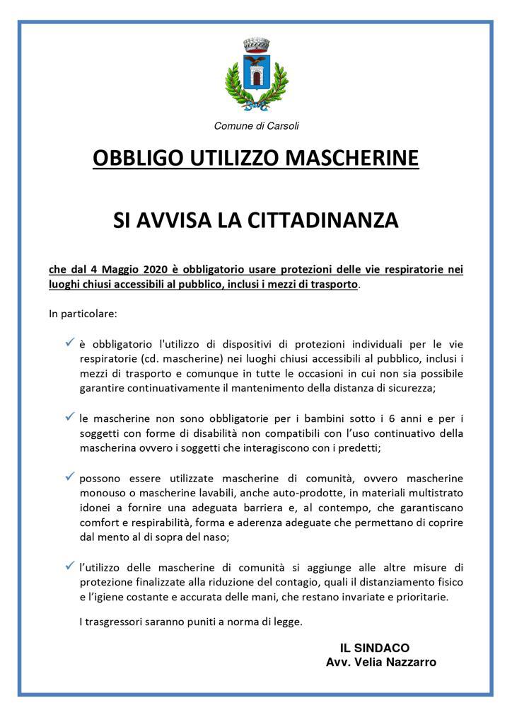OBBLIGO UTILIZZO MASCHERINE Pubblicata mer 06 mag, 2020