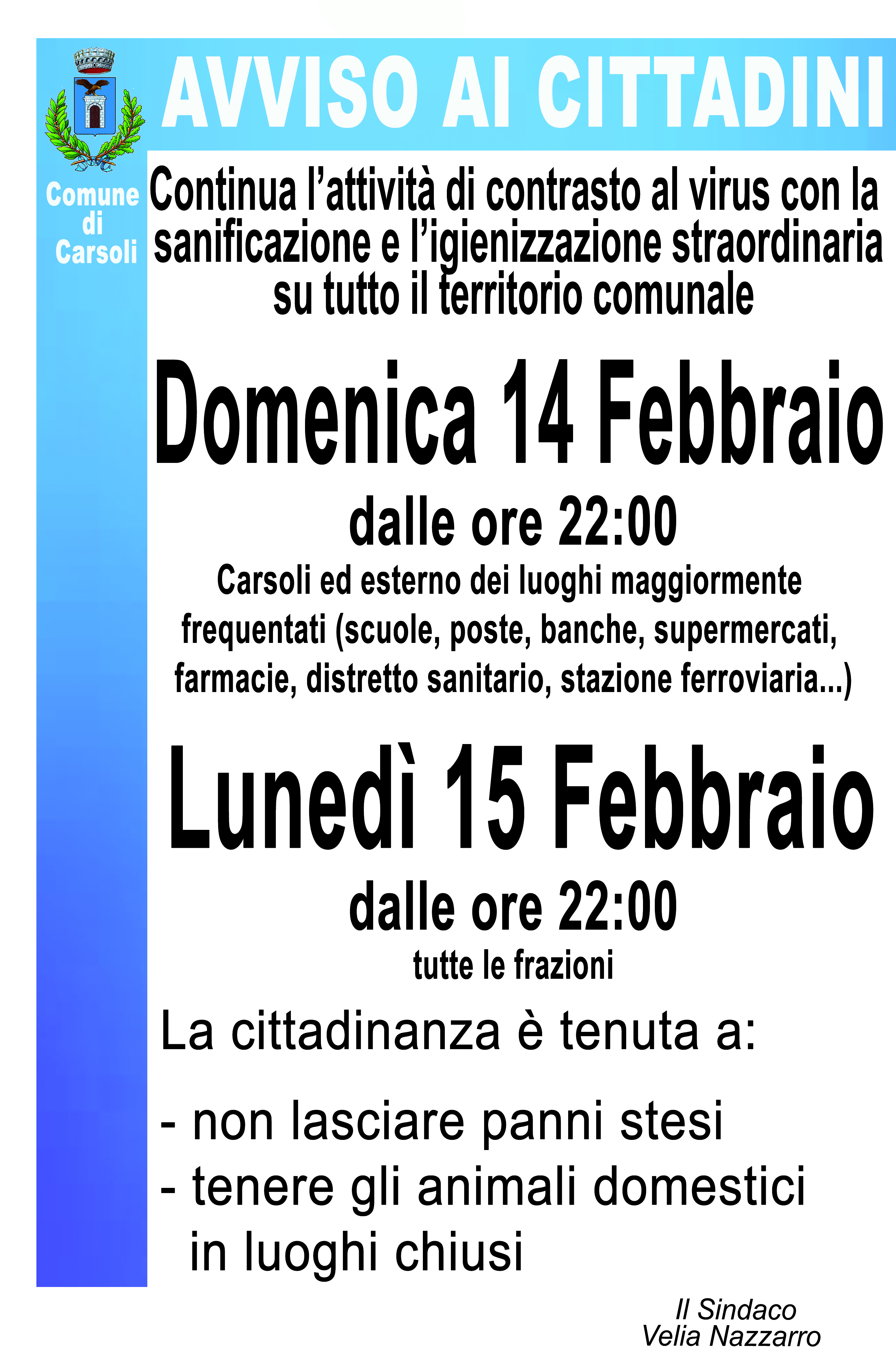 SANIFICAZIONE E IGIENIZZAZIONE STRAORDINARIA SU TUTTO IL TERRITORIO COMUNALE DOMENICA 14 FEBBRAIO DALLE ORE 22:00 - CARSOLI
